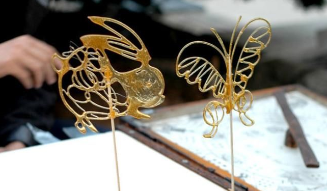 白糖加上少許飴糖放在爐子上用文火熬制,熬到可以牽絲時即可以用來澆鑄造型了。吉祥花果、飛禽、走獸想要什么都能一氣呵成,拿在手里舍不得吃掉!