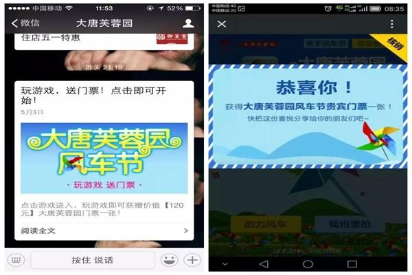 為回饋廣大芙蓉粉,即日起,立刻關(guān)注“大唐芙蓉園”官方微信公眾號,進(jìn)入微信游戲頁面,在朗朗上口的《大風(fēng)車》主題曲中開啟風(fēng)車轉(zhuǎn)轉(zhuǎn),邀請40位好友并成功助力解鎖風(fēng)車使其轉(zhuǎn)動,即可贏得價值120元的大唐芙蓉園貴賓票一張。快快轉(zhuǎn)動七彩風(fēng)車,免費暢游芙蓉園啦!