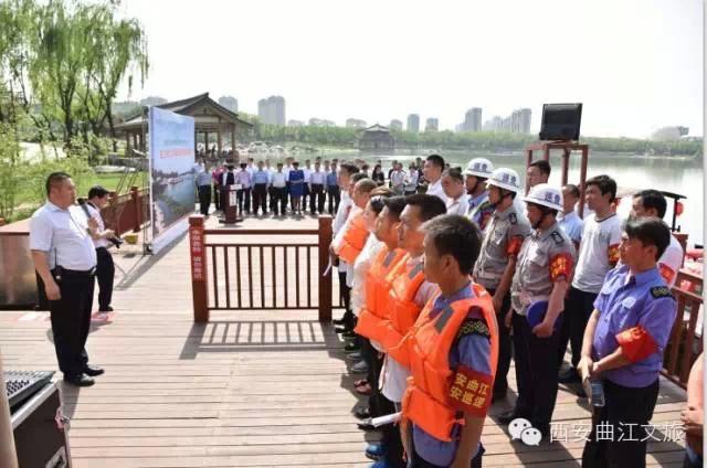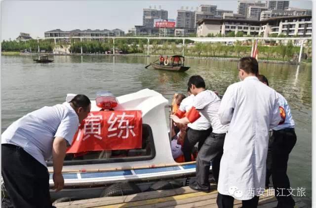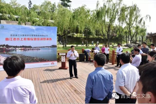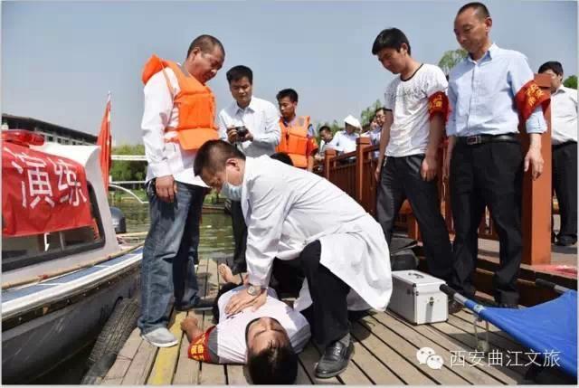 會議結(jié)束后,由大雁塔景區(qū)管理服務(wù)有限公司組織的一場實戰(zhàn)型水上應(yīng)急救生演練活動在曲江池碼頭展開,隨著一名“游客”不慎入水,本次演練正式開始:值班人員發(fā)現(xiàn)游客入水后立即上報辦公室,辦公室經(jīng)理利用對講機通知應(yīng)急救援組、現(xiàn)場警戒組、醫(yī)療救護組、和諧號救生艇,各組收到指令后第一時間趕往事發(fā)現(xiàn)場開展救援工作,通過現(xiàn)場警戒組封鎖現(xiàn)場,應(yīng)急救援組迅速派出2名救生員下水施救并通過和諧號救生艇成功將落水者救起,醫(yī)療救護組對落水游客實施了心肺復(fù)蘇術(shù)后送往醫(yī)院治療。