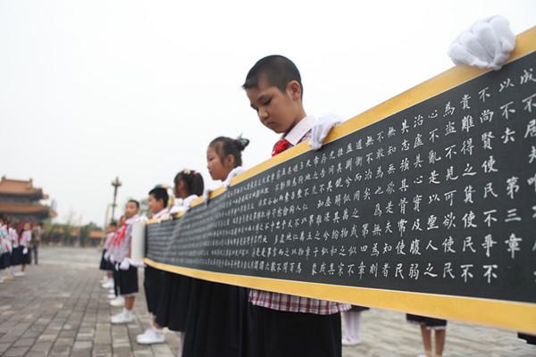 9月8日,在終南山古樓觀景區(qū)開(kāi)展任法融會(huì)長(zhǎng)藝術(shù)作品展暨《道德經(jīng)》長(zhǎng)卷行走活動(dòng)啟動(dòng)儀式?;顒?dòng)邀請(qǐng)北京市著名書(shū)法家剪彩并現(xiàn)場(chǎng)揮筆,現(xiàn)場(chǎng)氛圍很有“墨氣”?;顒?dòng)最后由百名學(xué)生一起拉開(kāi)名家手書(shū)《道德經(jīng)》長(zhǎng)卷并集體朗誦《道德經(jīng)》,學(xué)習(xí)國(guó)學(xué),從娃娃抓起。此次活動(dòng)展現(xiàn)樓觀歷史文化,全面彰顯任法融和《道德經(jīng)》這兩個(gè)有巨大影響力的文化品牌,提高了景區(qū)知名度。